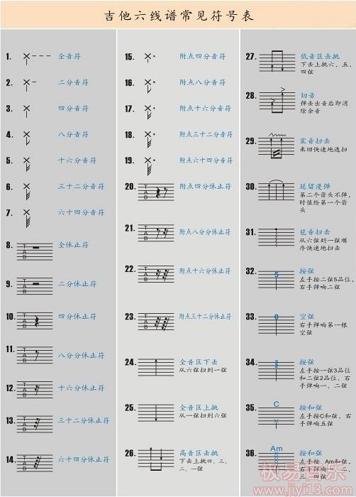 一张完整的吉他谱,只有配合这些标记才能完整的表达,常见的符号我们要熟记于心,读谱的时候要像读汉子一样快速反应并作出相应的动作,以至于达到条件反射的效果。特别是一些华彩比较多,和弦比较复杂的谱,在准确按弦的同时把握好曲子演奏上的诸如速度、时值等要求,才能忠实的反映出原曲的思想。