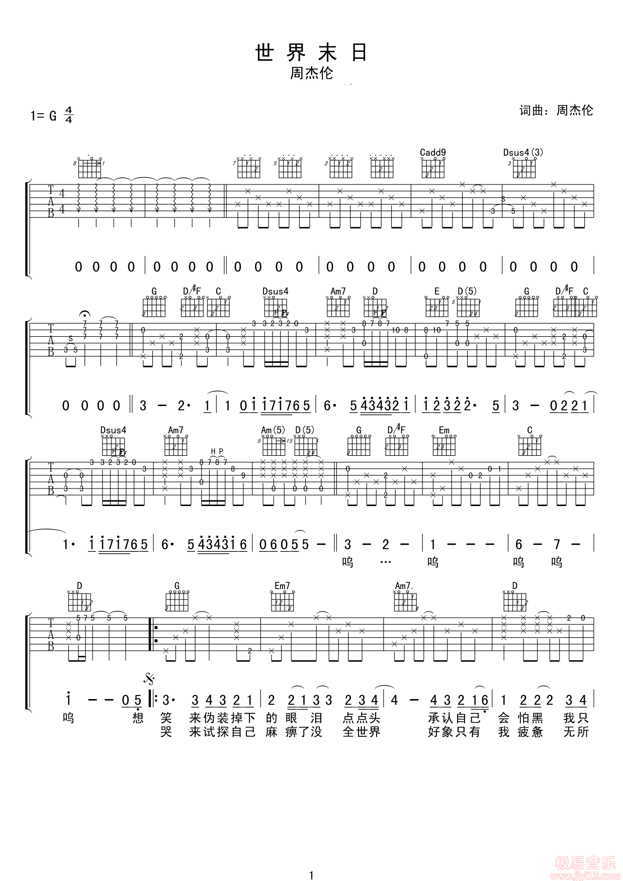 周杰伦《世界末日》高清吉他弹唱谱G调完美版原版编配+视频示范