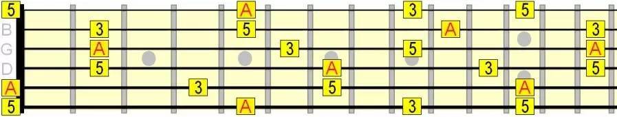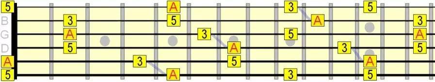 大和弦琶音:这是整个指板上的A大三和弦琶音(1-3-5)