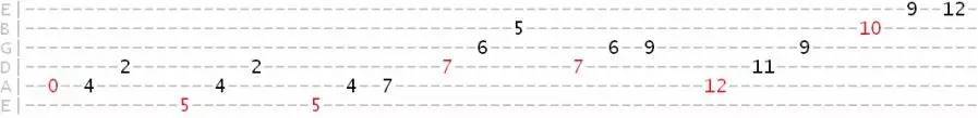 这样不管你从哪根弦哪一品开始,都可以找到附近最近的相同音。当你学习音阶以及和弦时,这些根音可以帮助你辨认指型中的具体音符。