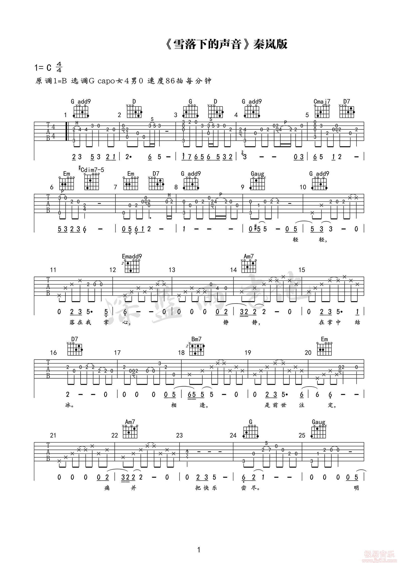 秦岚《雪落下的声音》高清吉他弹唱谱C调完美版原版编配+视频教学