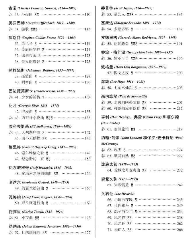 《世界经典吉他小品111首》挑选了动听、适合于吉他学习者演奏的小品111首。分为板块:“名家名曲”精选了60余首巴罗克、古典、浪漫时期音乐家的小品。“民歌民谣”搜罗了20余首意大利、美国、英国、德国、日本和俄罗斯的淳朴旋律。“影视金曲”重现了经典大片里熟悉的主旋律20余首。“通俗小品”还原了10余首本属于吉他的传统乐曲。