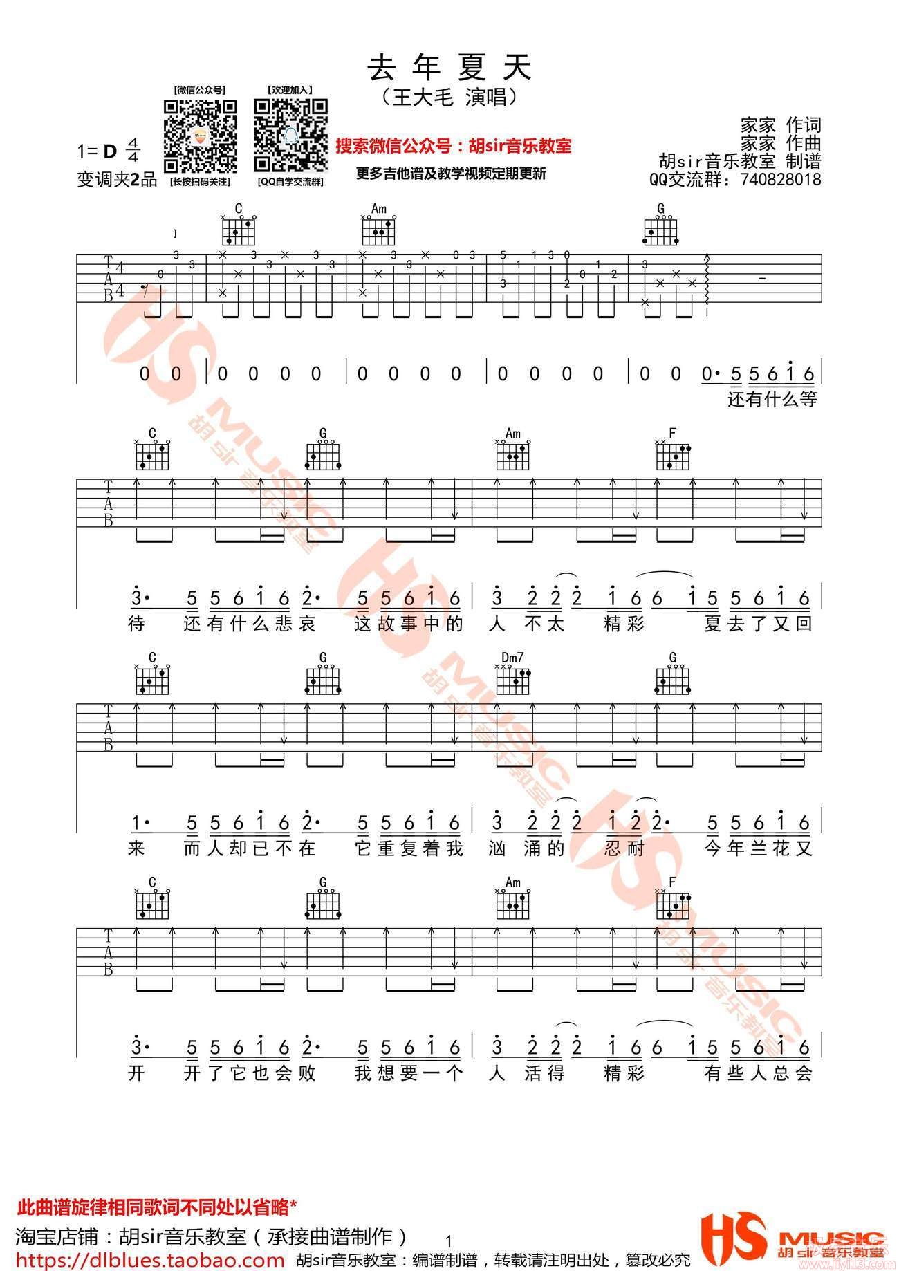 人生总是充满了惊喜与失落,有恰到好处的遇见,也有撕心裂肺的怀念;把心慢慢的释怀,我相信总有一天你会明白。”分享一首伤感但有点洗脑的《去年夏天》吉他谱,来自胡sir吉他编配,高清D调六线谱,图片五张谱例。