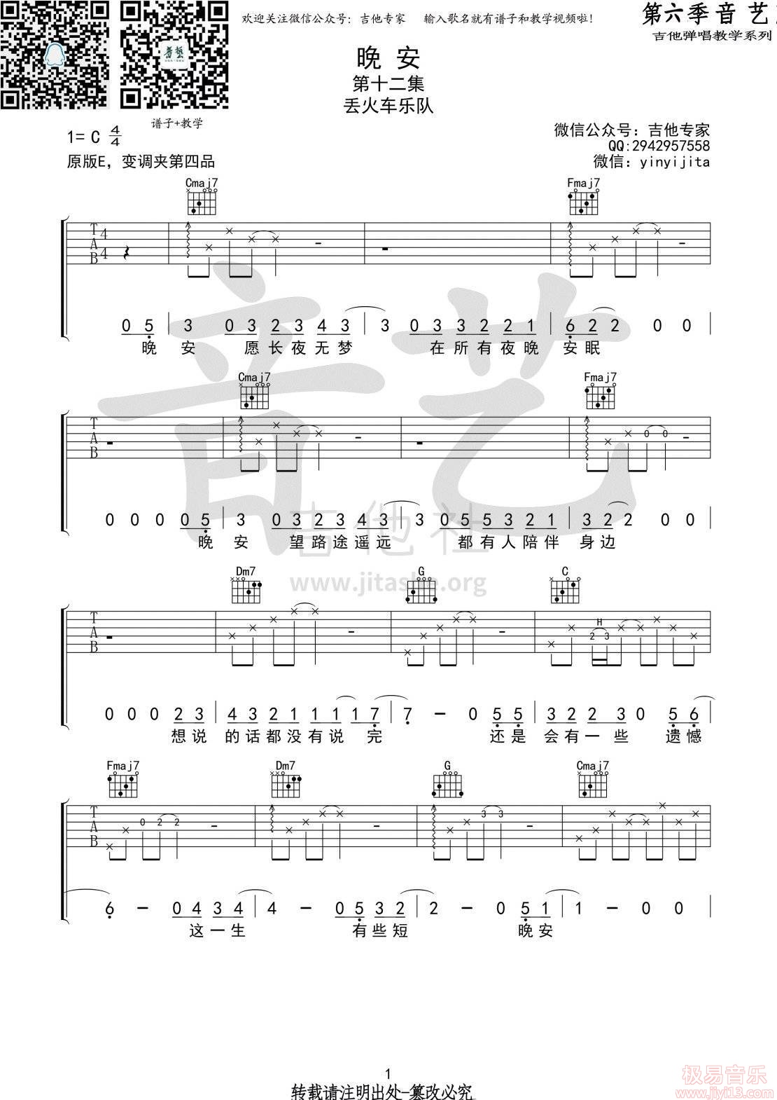 丢火车乐队《晚安》高清吉他弹唱谱C调完美版原版编配
