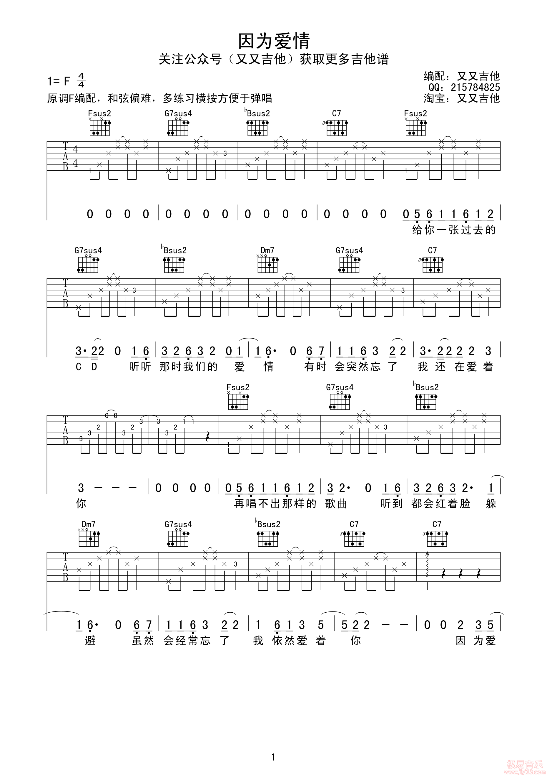 陈奕迅/王菲《因为爱情》高清吉他弹唱谱F调完美版原版编配+视频教学【三个版本】 玩易吉他教学版 【相关推荐】 陈奕迅/王菲《因为爱情》高清吉他指弹独奏谱+视频示范 琴歌《因为爱情》高清吉他指弹独奏谱+视频示范 【其他版本谱子】 版本一 版本二,双吉他版 123显示全文 登录收藏 说清楚问题,看清楚价格!墨迹不要问!讲价不要问!不信不要问!直接拉黑!
