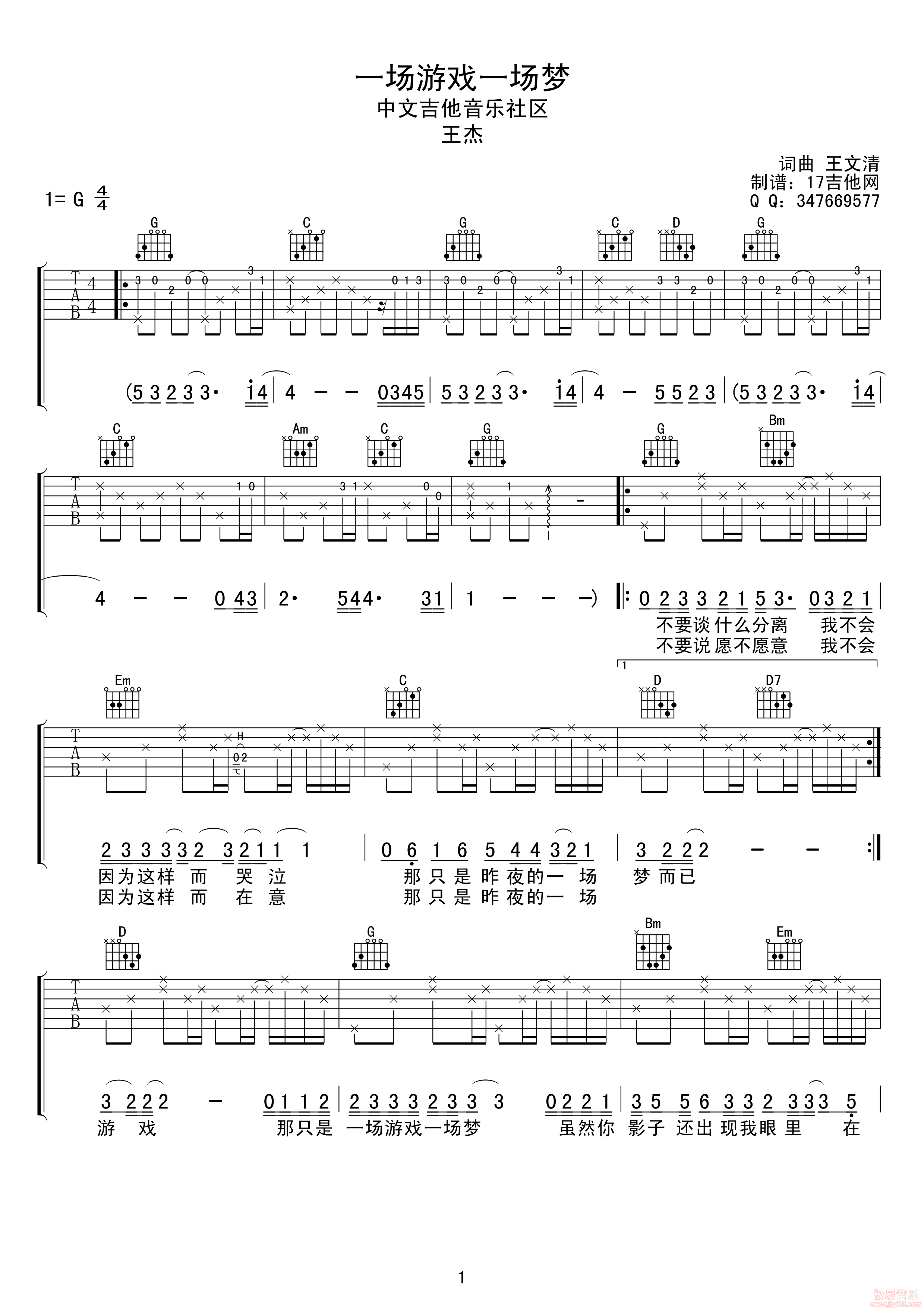 王杰《一场游戏一场梦》高清吉他弹唱谱G调完美版原版编配+视频教学